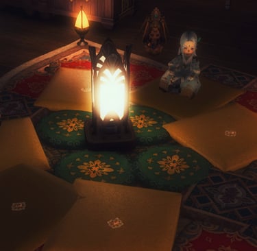 But here in Radz-at-Han, the wealth and wonderment represented by Lakshmi's veneration is divorced from the ancient deity now hailed by the ananta, though it does still exist. Diwali used to also mark the end of the year in the traditional Thavnairian calendar, so things like fortunetelling and gambling continue to bring the theme of wealth and prosperity forward. I even gave Ruby a hundred gil to bet on a children's game being held in the aetheryte plaza. The idea is to test one's luck and fortune for the upcoming year, rather than as the ananta would argue, to venerate Lakshmi.